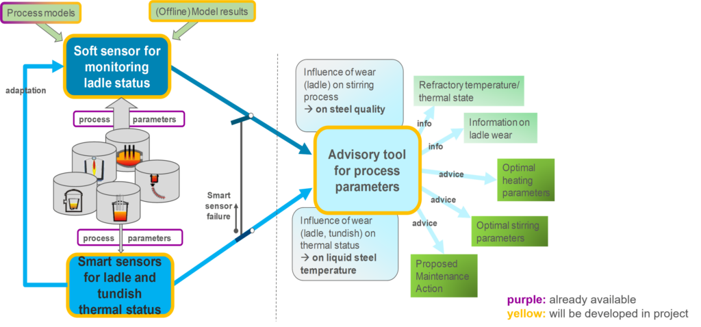 The structure of the complete monitoring and the novel Advisory Tool for the actual ladle status is shown together with input and output variables, where the framing colour “purple” indicates already existing variables and “yellow” the tools/variables to be developed within SmartLadle.